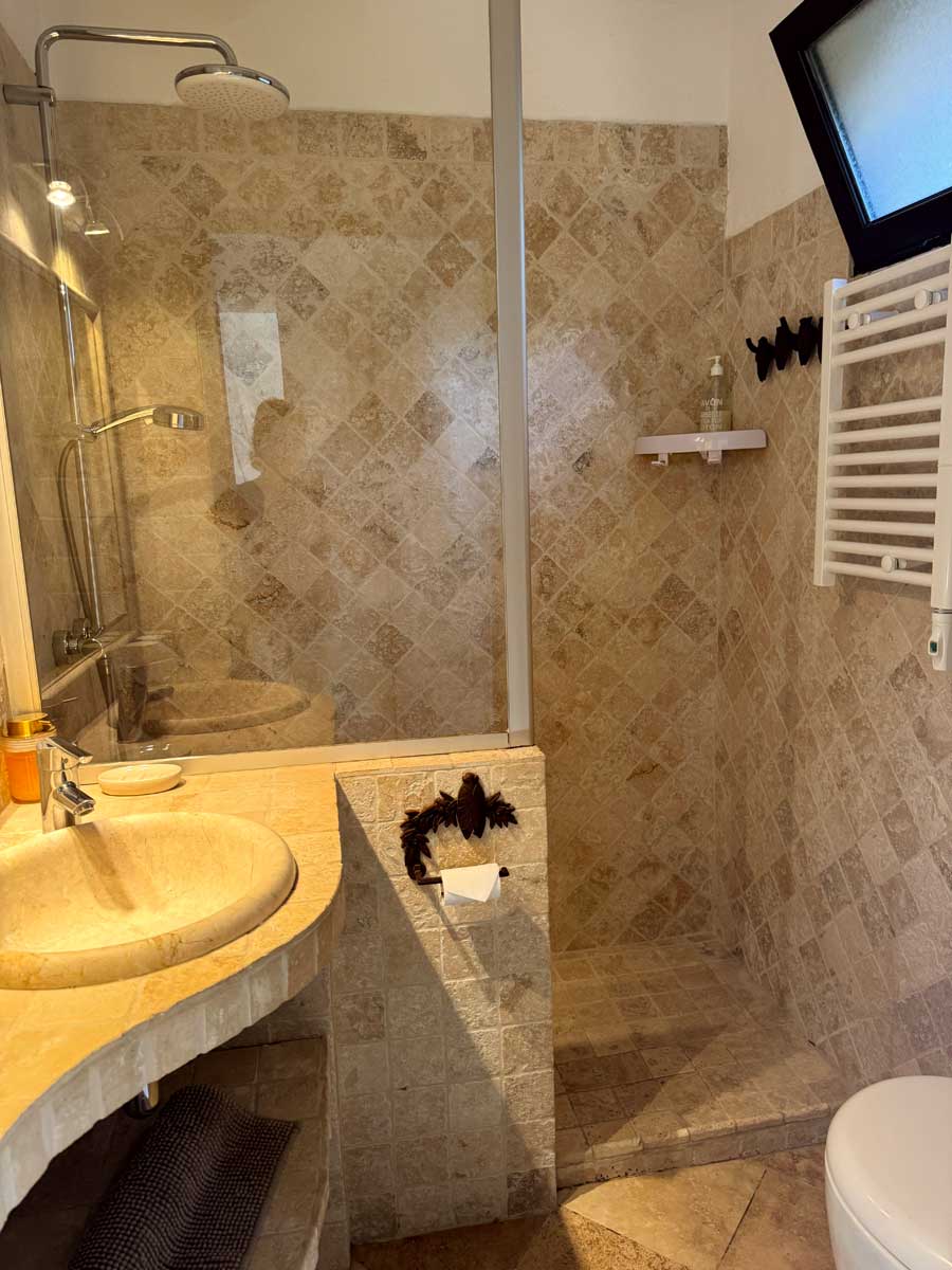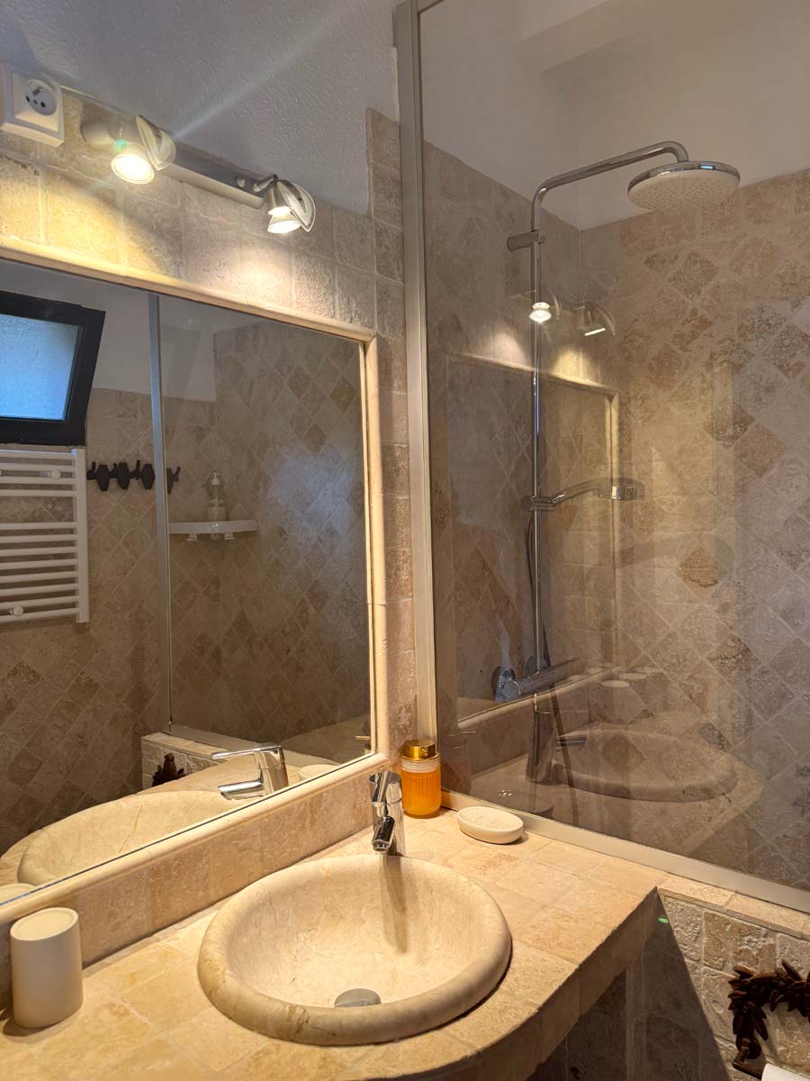 La salle d’eau privative est équipée d’une douche à l’italienne, d’un lavabo, d’un sèche-cheveux et de WC.